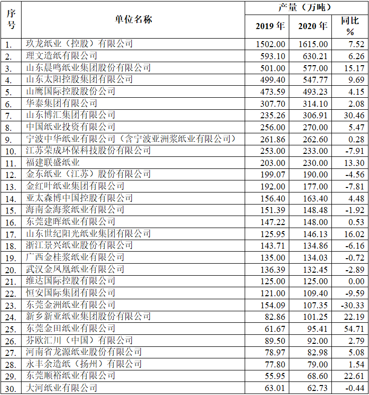 附表:2020年重點(diǎn)造紙企業(yè)產(chǎn)量前30名企業(yè)